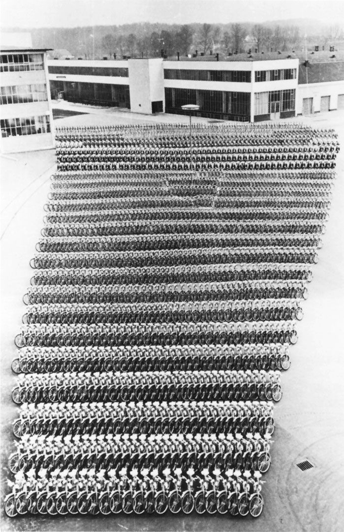 The photo shows the daily production of 1,000 Quickly, 350 scooters and motorbikes and 250 bicycles. NSU